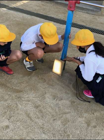 「光のせいしつ」を学習しています。はね返した日光の進み方や、はね返した日光を重ねたときの明るさと温度について実験を行いました。