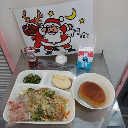 和風焼きそば、きゅうりのしょうがづけ、りんご