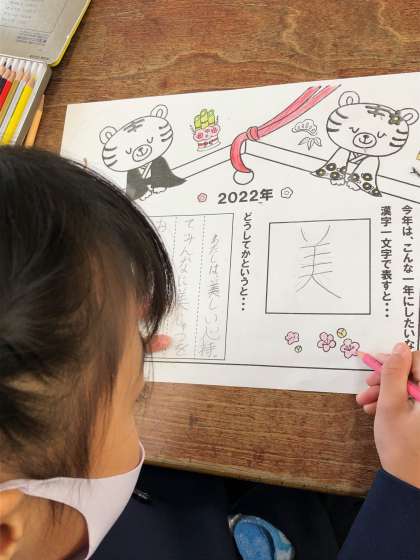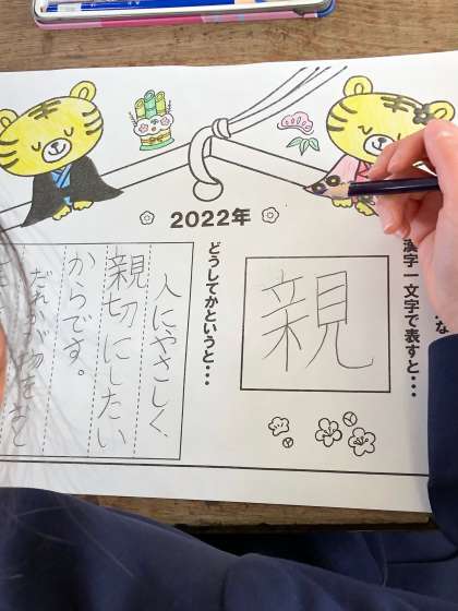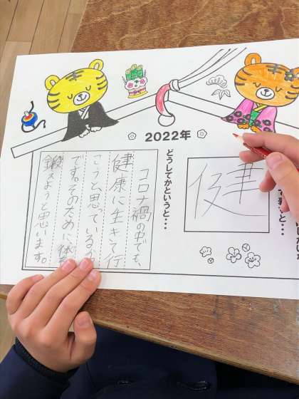 子どもたちは、めあてを考え、「今年はこんな一年にしたい!」という思いを、漢字一文字で表しました。その漢字を選んだ理由から、一人一人の思いがよく伝わりました。