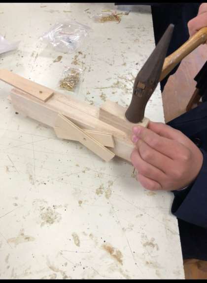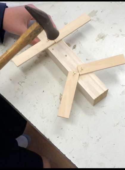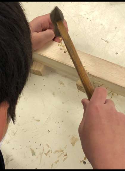 いろいろなうち方をためしながら、つくりたいものをイメージしました。くぎをうってできる形を見つけ、くふうしてつくりました。