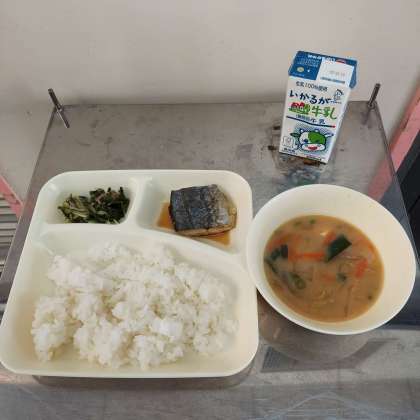 さごしのしょうゆだれかけ、みそ汁、みずなの煮びたし