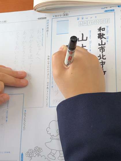 はがきの書き方や、これまでに学習した「書写のかぎ」を振り返り、お手本をよく見て丁寧に書きました。
