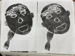 今週は、一月からコツコツ作ってきた紙版がを子ども達と一緒に擦りました。紙を貼りつけるのに苦労しましたが自分の顔を一生懸命に作ることができました。上手するのとができたかな?