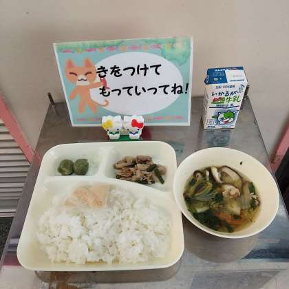 豚肉とれんこんのいため煮、五目汁、きな粉よもぎだんご