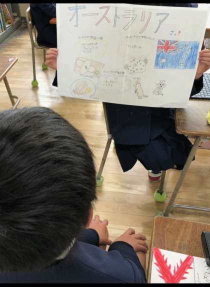 「外国のことをしょうかいしよう」の学習で、ポスターを作りました。
