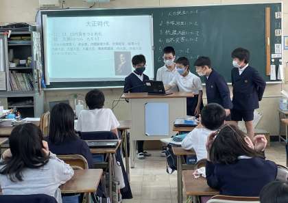 この1年間で学んだことを学習成果として発表を行いました。パワーポイントなどを使って自分たちで発表原稿を作成し、1年間で学んだことやより深く自分たちで学んだことを発表しました。