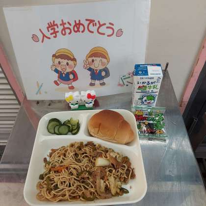 焼きそば、きゅうりのしょうがづけ、豆こんぶ