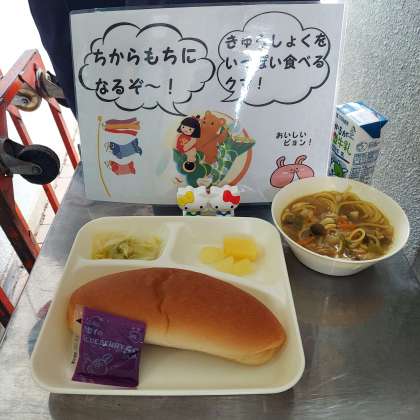 カレースープスパゲッティ、キャベツのピクルス、りんご(カット缶)