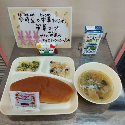 金時豆の中華おこわ、中華スープ、ツナと野菜のオイスターソースいため