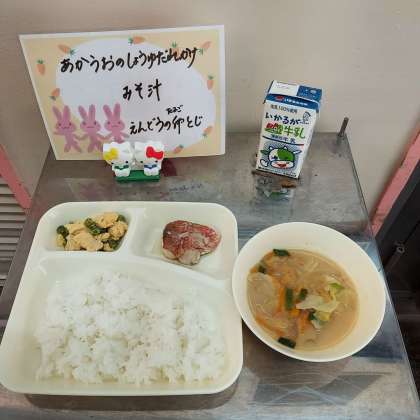 あかうおのしょうゆだれかけ、みそ汁、えんどうの卵とじ