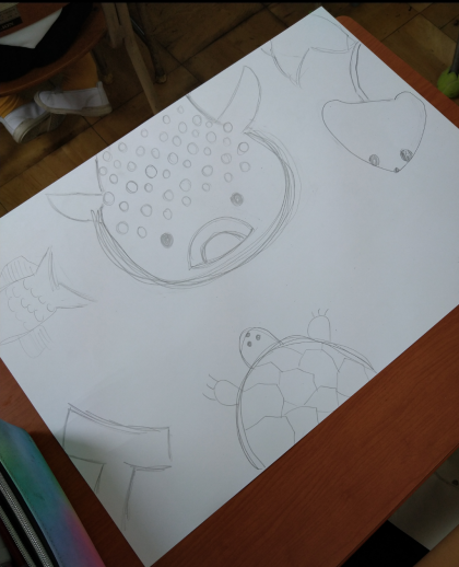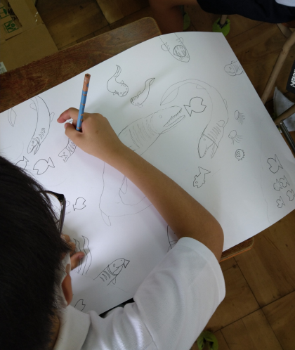 海遊館へ遠足へ行き、海の中の世界をじっくりと見てきました。そこで、図工では「海の中の世界」ということで、自分が想像した、自分だけの海の中の世界を描いています。