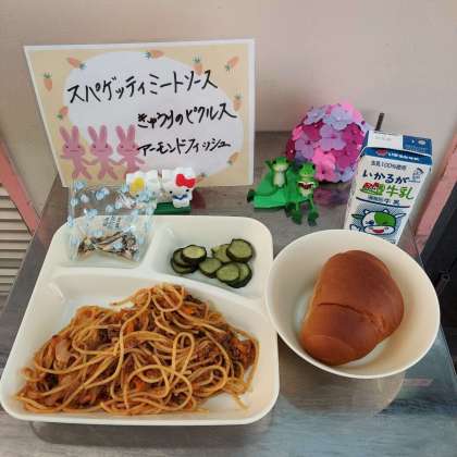 スパゲッティミートソース、きゅうりのピクルス、アーモンドフィッシュ