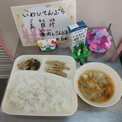 いわしてんぷら、五目汁、豚肉とさんどまめのいためもの
