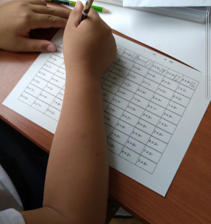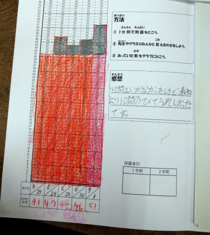 先週は計算力アップ週間でした。4年生は「かけ算」に取り組みました。1分間でどれだけの問題が解けるかにチャレンジしました。