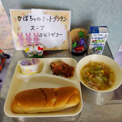 かぼちゃのミートグラタン、スープ、ぶどうゼリー