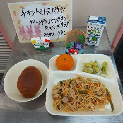 チキントマトスパゲッティ、グリーンアスパラガスとキャベツのサラダ、みかん(冷)