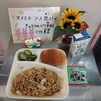 オイスターソース焼きそば、きゅうりのピリ辛あえ、ソフト黒豆