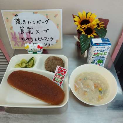 焼きハンバーグ、豆乳スープ、キャベツとピーマンのカレーソテー