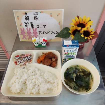 酢豚、中華スープ、アーモンドフィッシュ