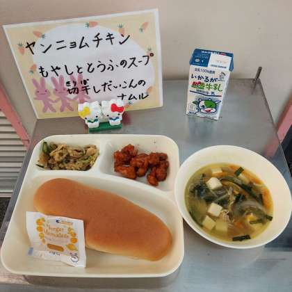 ヤンニョムチキン、もやしととうふのスープ、切干しだいこんのナムル