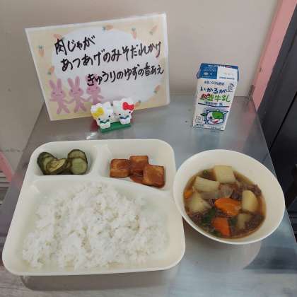 肉じゃが、あつあげのみそだれかけ、きゅうりのゆずの香あえ