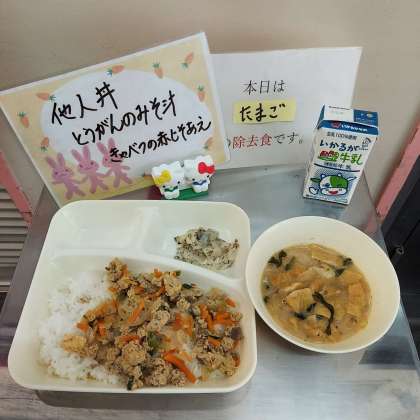 他人丼、とうがんのみそ汁、キャベツの赤じそあえ