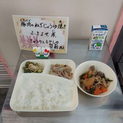 豚肉のねぎじょうゆ焼き、ふきよせ煮、きゅうりともやしの甘酢あえ