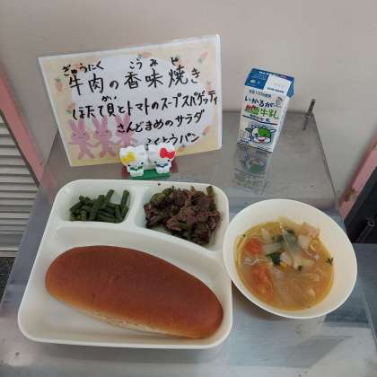 牛肉の香味焼き、ほたて貝とトマトのスープスパゲッティ、さんどまめのサラダ