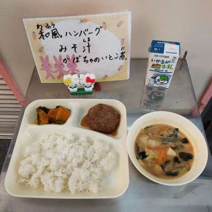 和風ハンバーグ、みそ汁、かぼちゃのいとこ煮