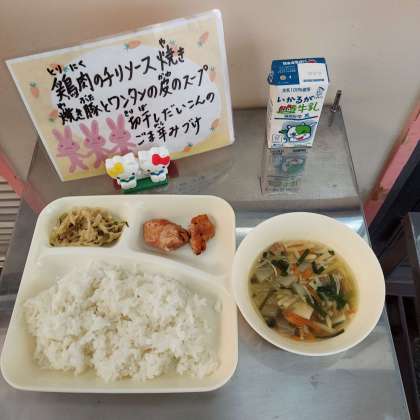 鶏肉のチリソース焼き、焼き豚とワンタンの皮のスープ、切干しだいこんのごま辛みづけ