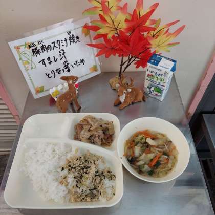 豚肉のスタミナ焼き、すまし汁、とりなっ葉いため