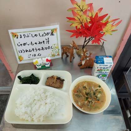 なまりぶしのしょうが煮、じゃがいものみそ汁、ほうれんそうのおひたし