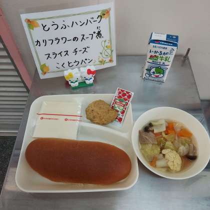 とうふハンバーグ、カリフラワーのスープ煮、スライスチーズ