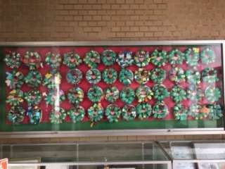 正門を入ってすぐの掲示板に1年生の子どもたちが作ったクリスマスリースを飾っています。色とりどりの可愛らしい作品となっていますので、学校に来校された際はぜひご覧ください。