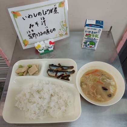 いわしのしょうが煮、みそ汁、高野どうふの煮もの