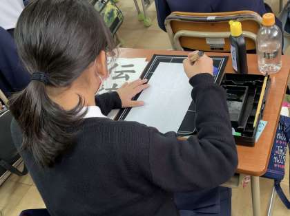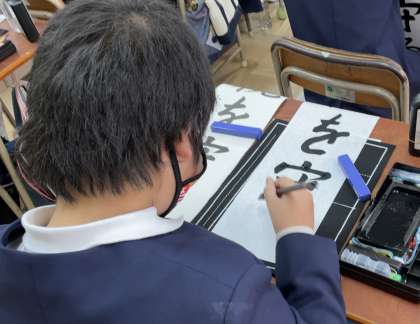 「伝統を守る」を毛筆で描きました。普段とは違う長半紙を使い、全体のバランスを捉えるのに苦労しつつも自分らしい良い字が書けました。
