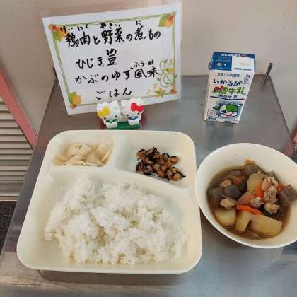 鶏肉と野菜の煮もの、ひじき豆、かぶのゆず風味