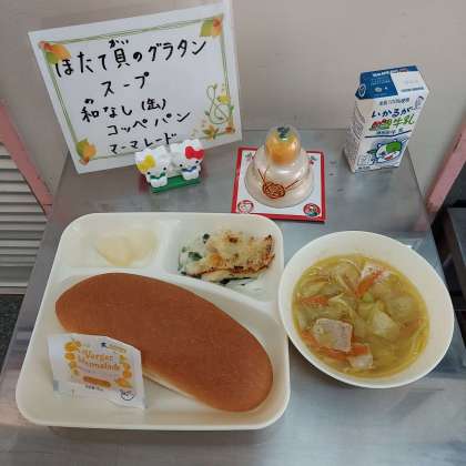 ほたて貝のグラタン、スープ、和なし(カット缶)