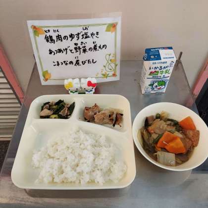 鶏肉のゆず塩焼き、あつあげと野菜の煮もの、こまつなの煮びたし