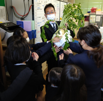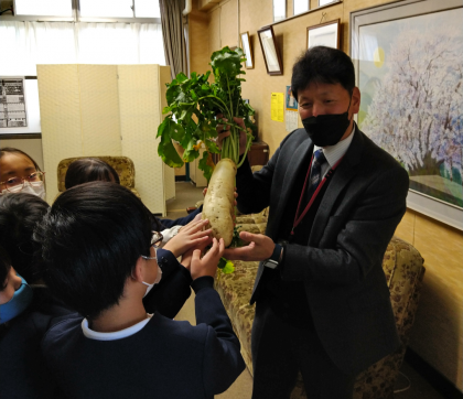 2学期から育てていた田辺大根を収穫しました。「大きくて立派な大根は、校長先生と教頭先生に渡したい」ということで、渡しに行きました。
