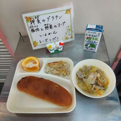 押麦のグラタン、豚肉と野菜のスープ、いよかん