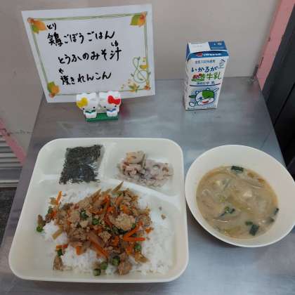 鶏ごぼうご飯、とうふのみそ汁、焼きれんこん
