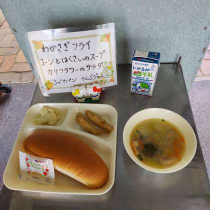 わかさぎフライ、コーンとはくさいのスープ、カリフラワーのサラダ