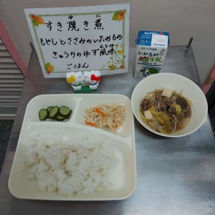 すき焼き煮、もやしとささみのいためもの、きゅうりのゆず風味