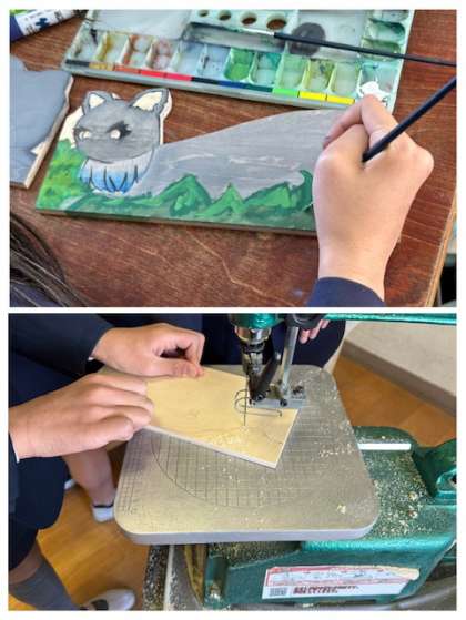 合板を電動のこぎりで切り取り、やすりで切断面を滑らかにしてから彩色しています。