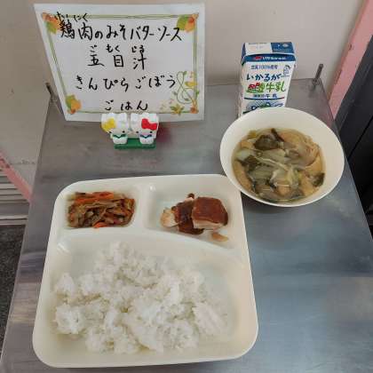 鶏肉のみそバターソース、五目汁、きんぴらごぼう