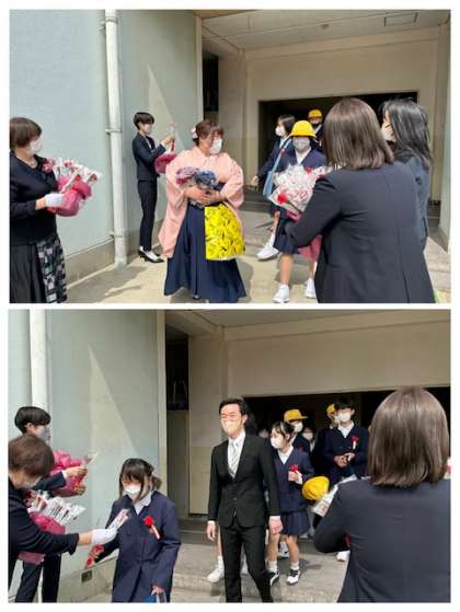 カーネーションを受け取って教職員や保護者から祝福を受けていました。