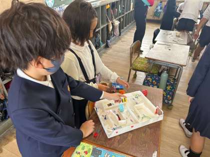 磁石の反発を利用した迷路、音の響きを利用した糸電話、振動を利用したとんとん相撲等々。工夫したおもちゃや釘打ちの位置を考えたスマートボールで楽しく遊べました。