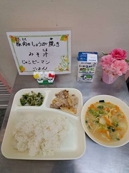 豚肉のしょうが焼き、みそ汁、じゃこピーマン