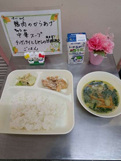 鶏肉のからあげ、中華スープ、チンゲンサイともやしの甘酢あえ